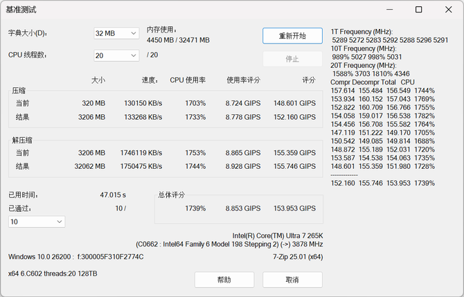 7-Zip测试中,总体评分153.953GIPS,相比在6400速度下,降低了约5%。