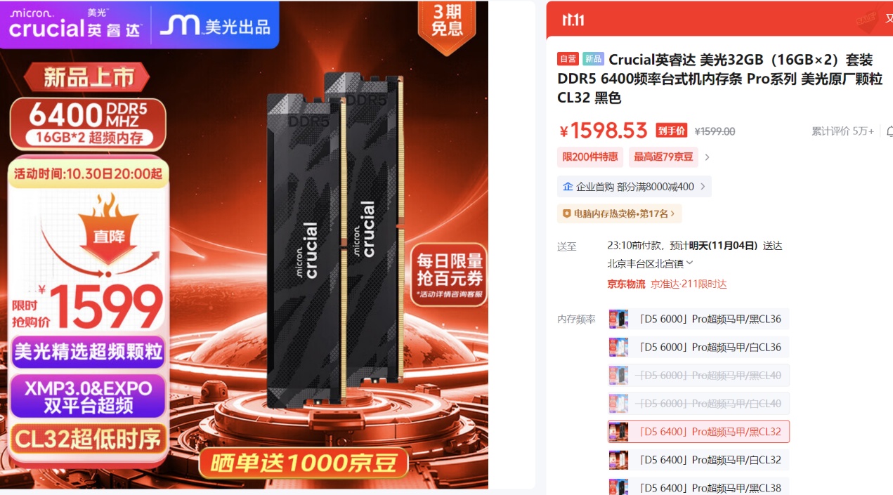 不过对于真正刚需的用户,我们还是首推 DDR5 产品,而且现在的 DDR5 在时序、稳定性以及兼容性等方面都有了全面优化。在刚刚过去的 10月份,Crucial 英睿达推出的DDR5 Pro OC 6400 CL32内存套装,就是针对此前产品的优化,专门为那些追求更高性能的用户而设计的。