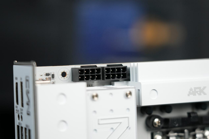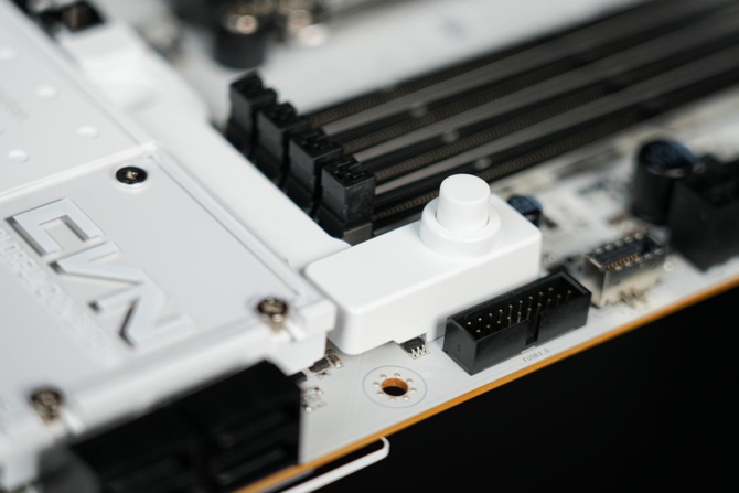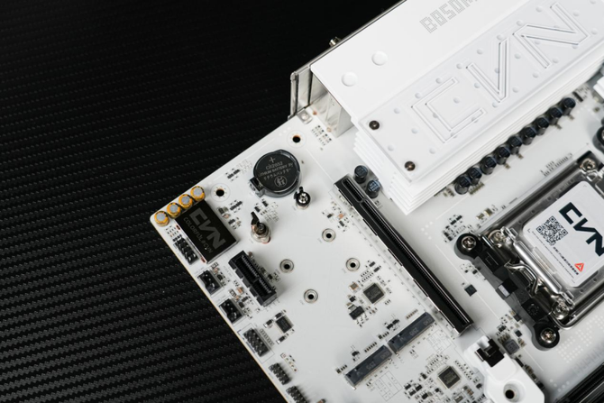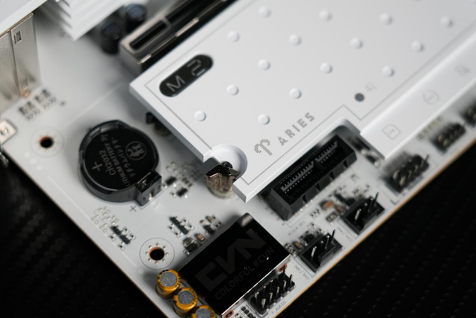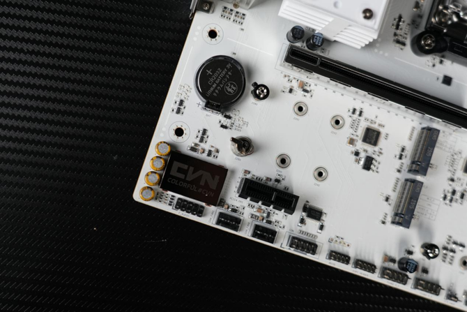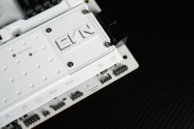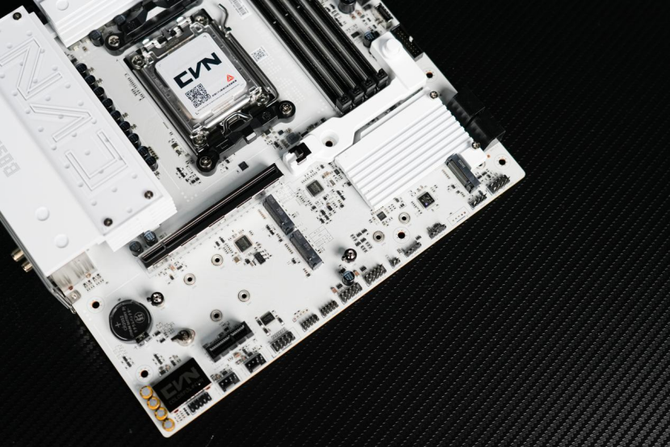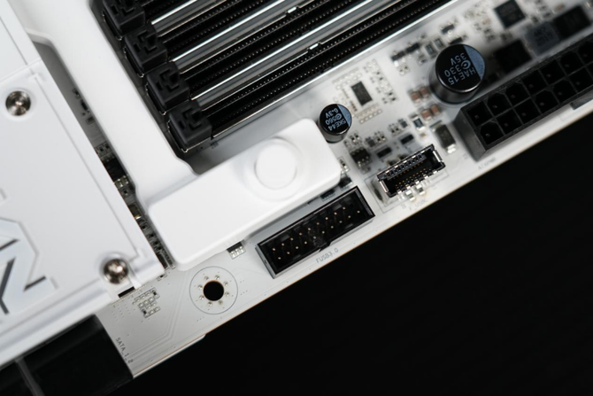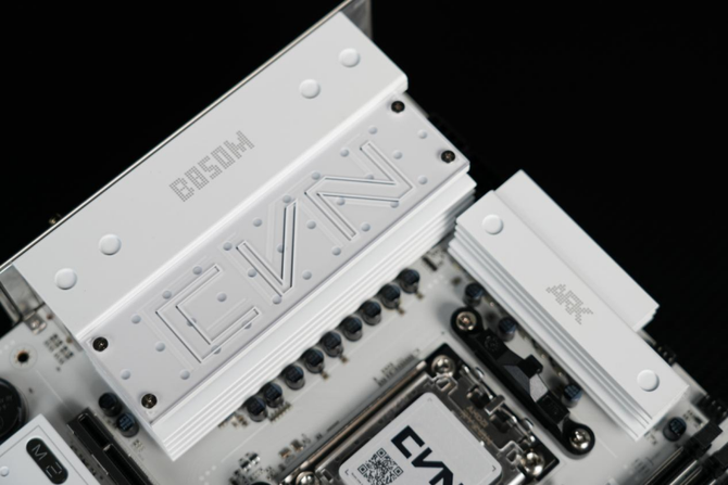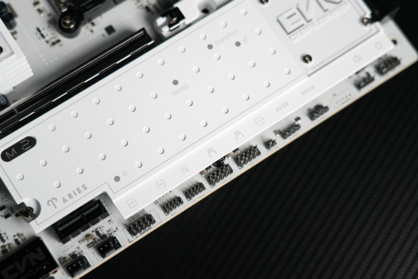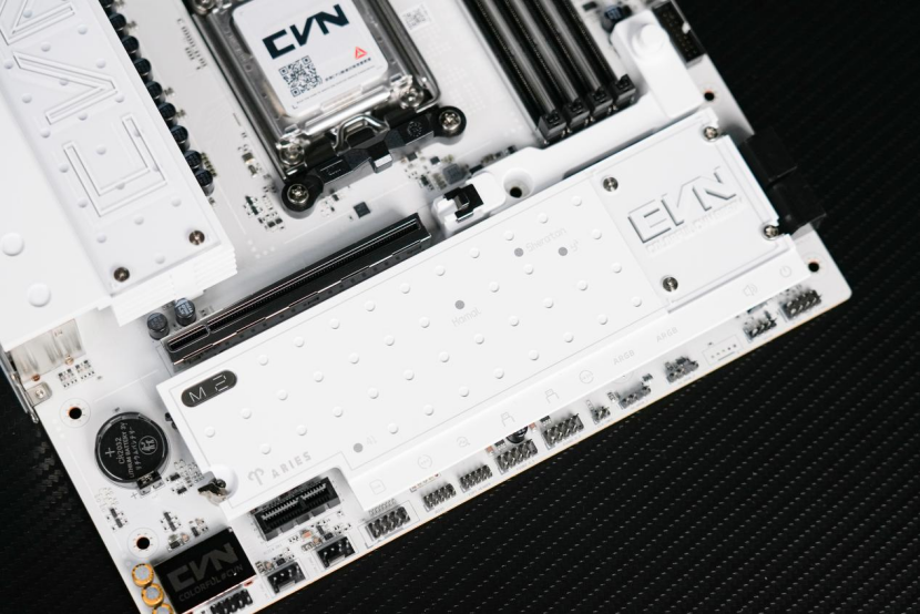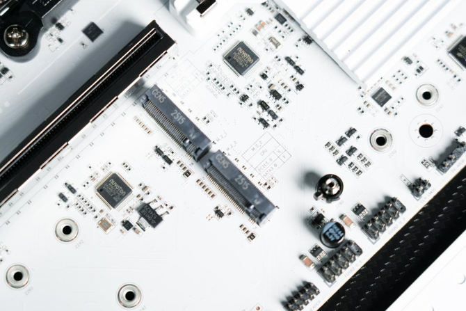 来到主板的下方,可以看到整个主板的M.2固态硬盘的拓展位由一整块的纯白色金属散热装甲覆盖。