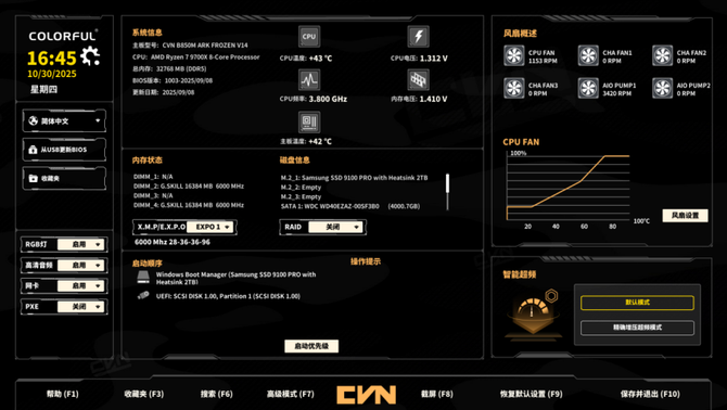 七彩虹为自家的不同系列的主板提供了不同的BIOS界面风格,这次的主板主界面采用了非常简洁的可视化窗口形式的设计,并且颜色方面也更加漂亮,重要的信息可以说一目了然,即便新手用户进入到这个界面,常见的设置也能轻松进行调整,比如风扇的转速、运转的模式,内存的EXPO一键超频的功能,灯光效果控制,升级BIOS等,都能在主界面找到。
