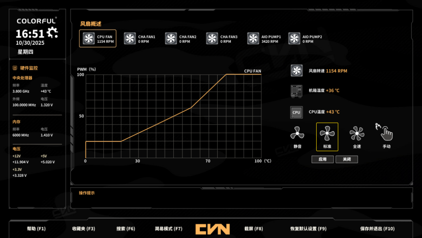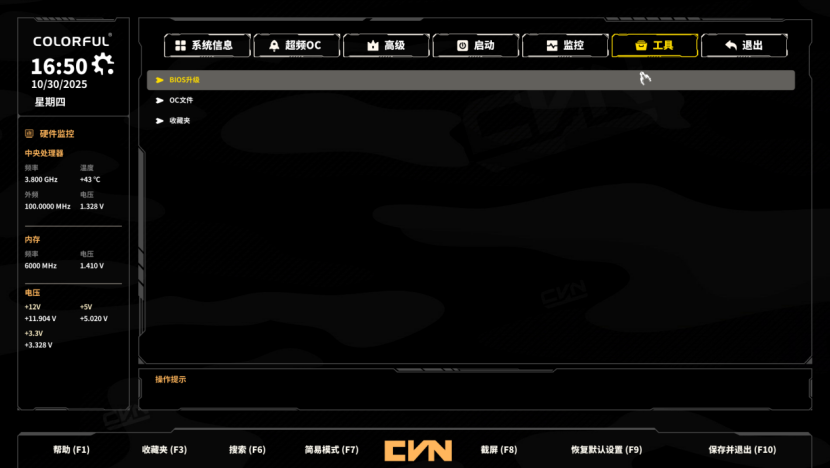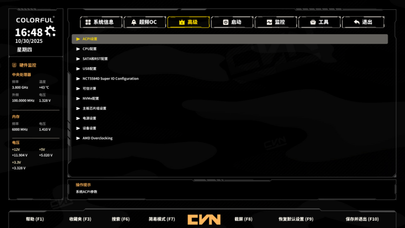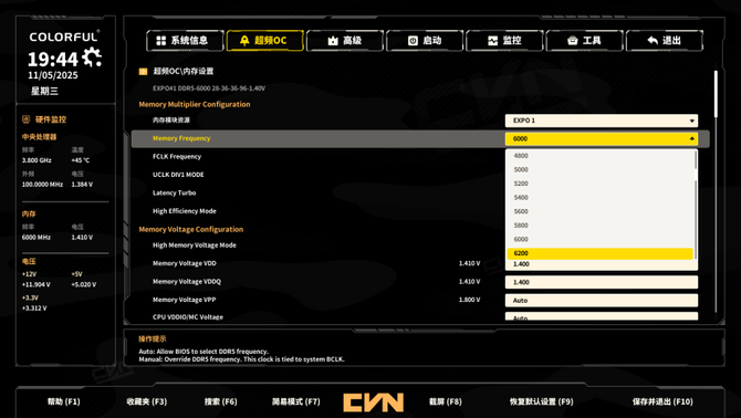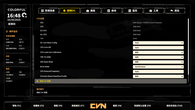 打开内存设置后,还可以开启低延迟和高效能模式进一步提高游戏帧率,这版BIOS无论是简易模式还是高级模式完成度都相当不错,操作逻辑也很顺手,看得出七彩虹在BIOS上的巨大进步和用心。