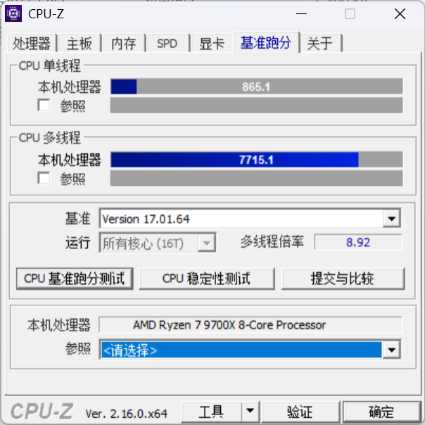 CPU-Z单核心为865.1,多核心分数为7715.1。