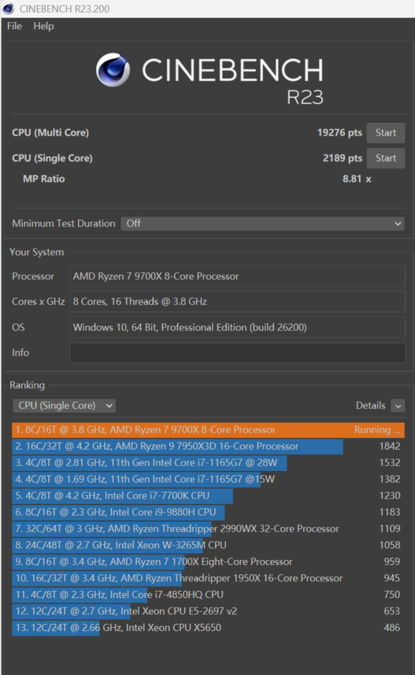 CINEBENCH R23的单核心成绩为2189,多核心成绩为19276。