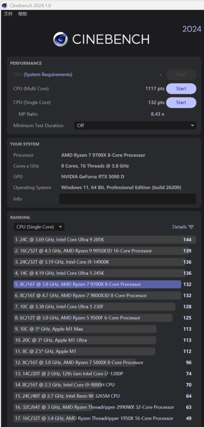 CINEBECH 2024的单核心成绩为132,多核心成绩为1117。