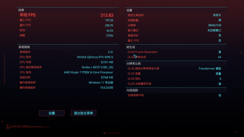 《赛博朋克2077》的4K分辨率下,DLSS 4质量,特效为光追超速,开启4x帧生成,最终的游戏平均帧数来到了211.23。
