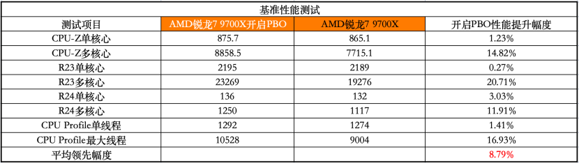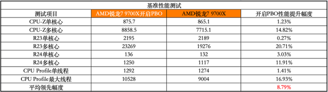 开启PBO之后,基准性能平均提升了8.79%,其中R23多核心性能提升幅度高达20.71%。