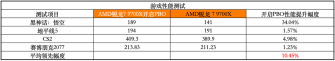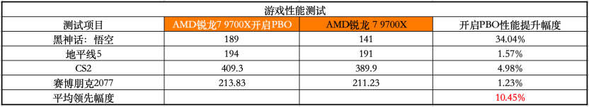 游戏性能测试方面,四款游戏的平均提升幅度达到了10.45%,其中黑悟空的提升幅度达到34.04%,所以对于玩家来讲,仅需要在主板的BIOS界面直接打开PBO,性能就能有10%的提升,这个提升幅度非常客观,如果你是高阶用户的话,还可以进行精细化的频率、电压的调整,持续超频,不得不说这次七彩虹B850M ARK 方舟在配置和性能释放上,做到了目前行业的领先水准。