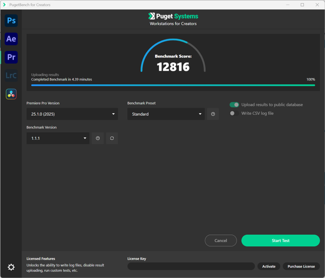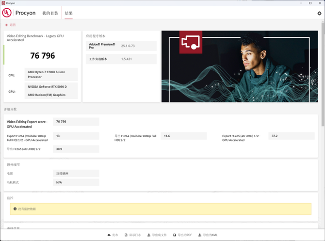 测试PR后期视频剪辑的Puget 分数中,综合得分达到12816,这个分数基本上能够轻松应对所有的4K高清分辨率的PR视频剪辑、回放等任务,视频剪辑毫无压力。