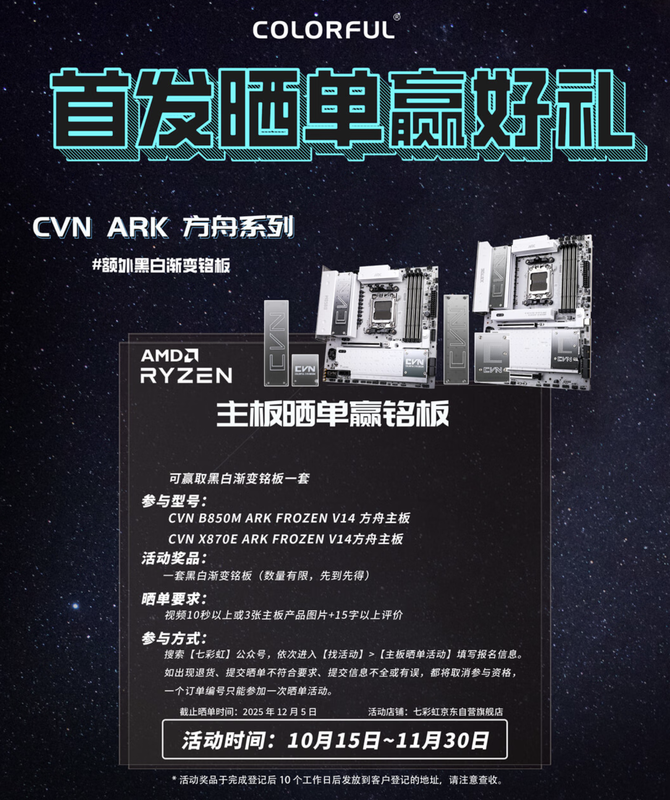 并且七彩虹还为现阶段入手B850M ARK 方舟和X870E ARK 方舟主板并且晒单的用户,提供一套黑白渐变铭板,数量有限先到先得。