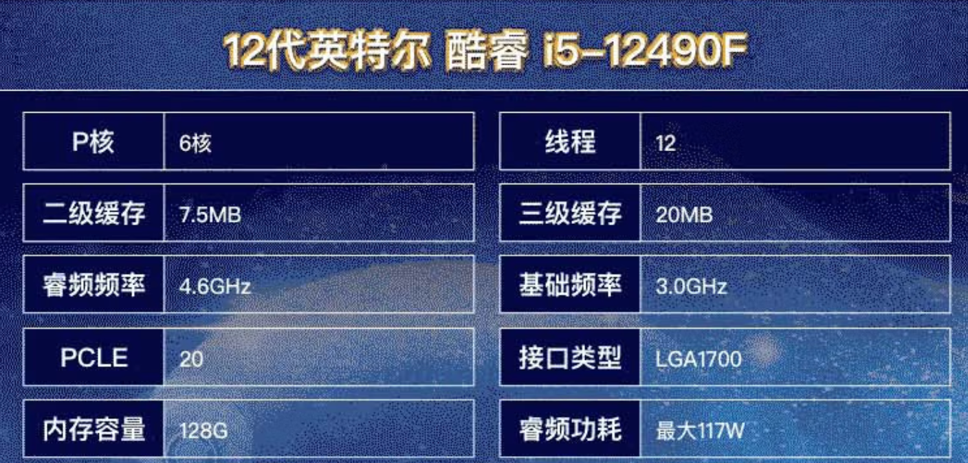 先来看一下i5-12490F的核心参数,这颗英特尔酷睿i5-12490F处理器采用全大核设计,拥有六核心十二线程规格,配备20MB三级缓存。全大核+大三缓的组合配置,非常适合游戏玩家。