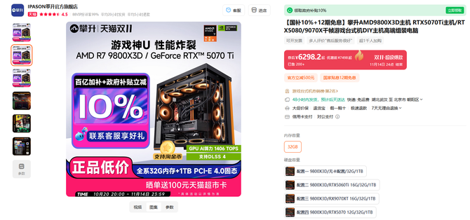 接下来这款同样来自AMD的ESI合作伙伴IPASON攀升出品的游戏整机,依然使用AMD 锐龙7 9800X3D处理器搭建,保证了游戏性能的最大化,主板、显卡、内存和SSD同样多种配置可选,玩家们可以根据需要来选配。目前这款整机的优惠力度非常大,综合算下来,国补+政府补贴立减10%搭配12期免息,支持淘金币晒单还送100元天猫超市卡,真的非常划算,推荐大家立刻入手。