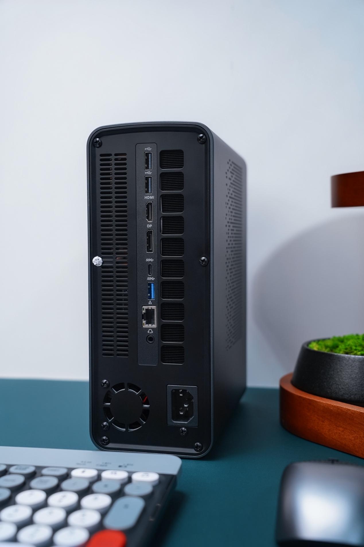 机身背部设计整洁,出风格栅与各类接口有序排布,接口数量充足,能满足专业生产力需求,具体有两个USB-A(USB 2.0 标准)接口,适合连接键盘、鼠标等外设;一个HDMI2.1接口、一个DP1.4接口,加上正面的Type-C接口,最多可支持4块屏幕同时输出,轻松应对多任务办公、3D建模分屏预览等场景;一个同样支持USB4和DP1.4视频输出的Type-C接口;一个支持USB3.2 Gen2的USB-A高速接口;一个RJ45网口,保障网络连接稳定;以及一组音频接口。