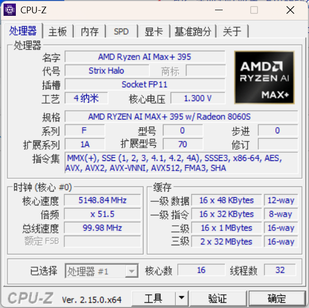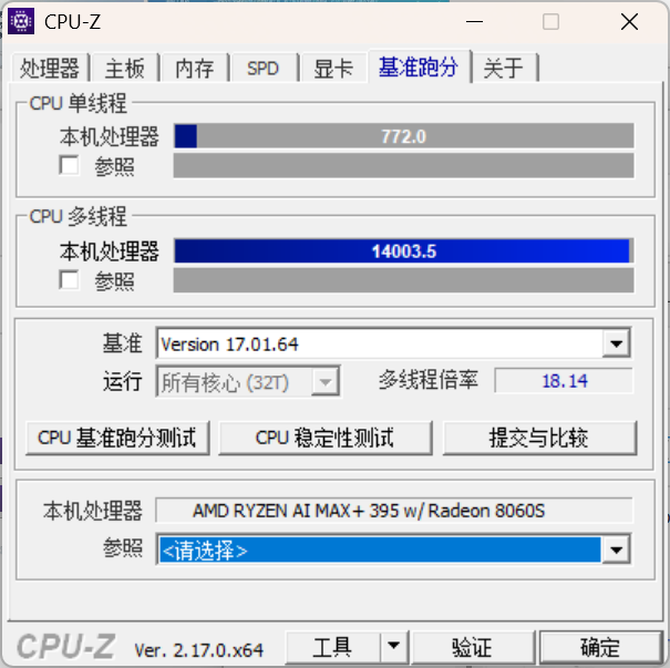 CPU-Z测试当中,AMD锐龙AI Max+ 395单核成绩772,多核成绩14003.5。