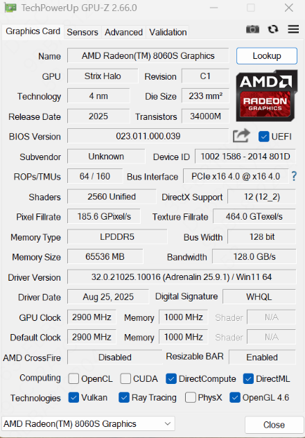 AI性能方面,在UL Procyon的AI推理测试中,AMD Ryzen AI项目上,AMD锐龙AI Max+ 395处理器的NPU性能分数为1823分,能高效完成图像识别、语音处理等AI推理任务。