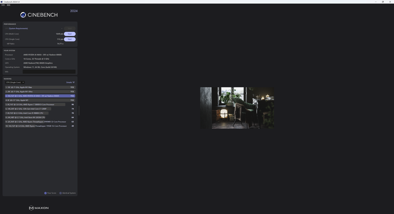 CineBench 2024测试中,单核成绩为149pxs,多核成绩为2199pxs。