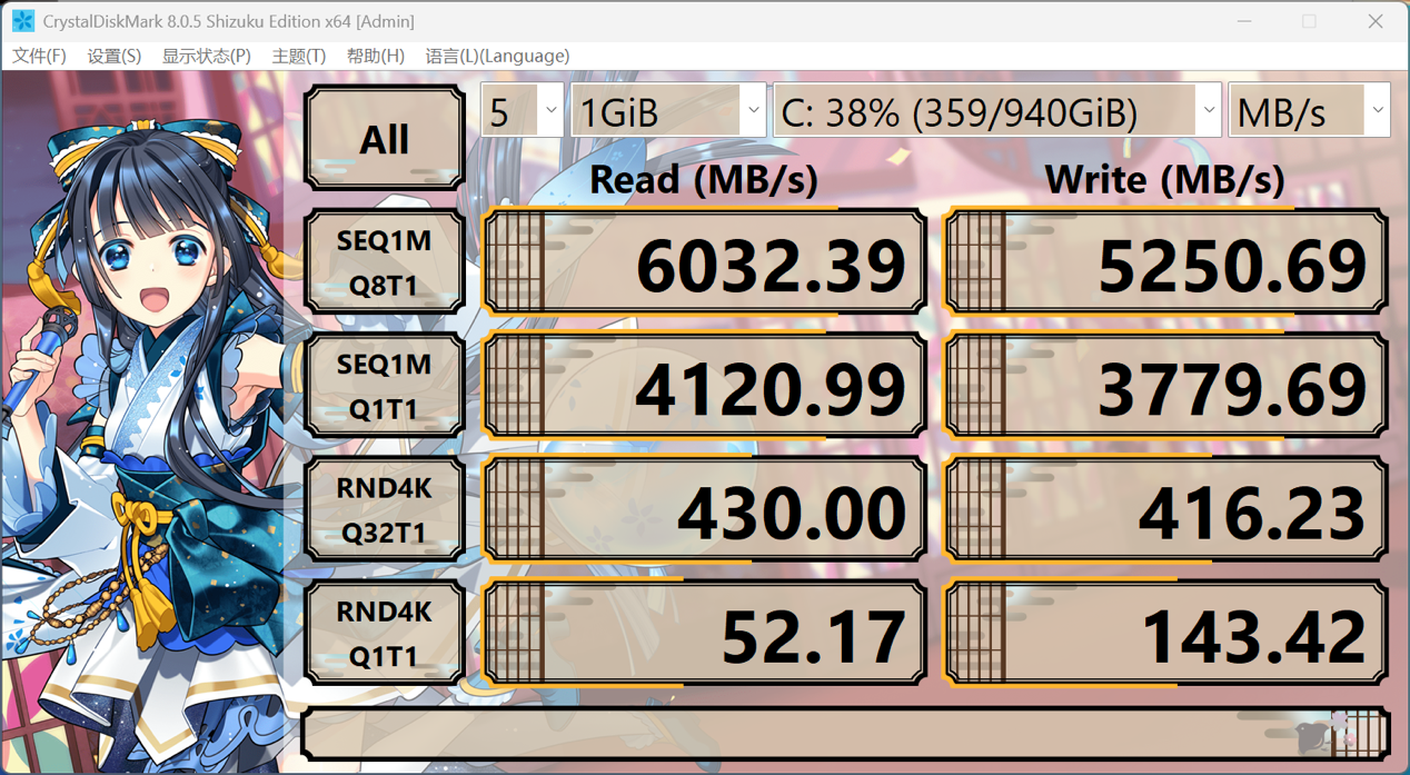 存储上,设备搭载了2T固态硬盘,预留一个PCIe 4.0速率的M.2硬盘接口,方便用户根据需求进行容量拓展。使用CrystalDiskMark进行硬盘读写测试,测得读取速度为6032MB/S,写入速度为5250MB/S,这样的高速存储在加载大模型、播放4K视频素材时,能保障使用的流畅性,不会出现明显的延迟。