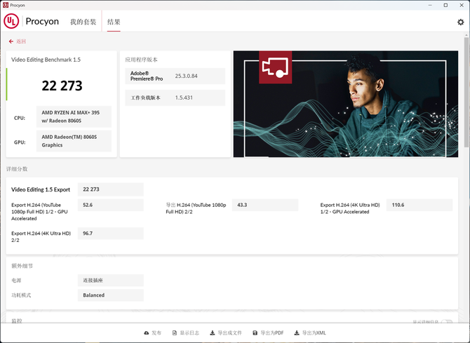 在Procyon视频剪辑渲染测试中,调用Adobe Premiere Pro软件进行剪辑、渲染、导出等专业剪辑流程,最终得分高达22273分,即使处理4K视频素材,也能保持流畅的操作和较快的导出速度,为视频创作者节省大量时间。