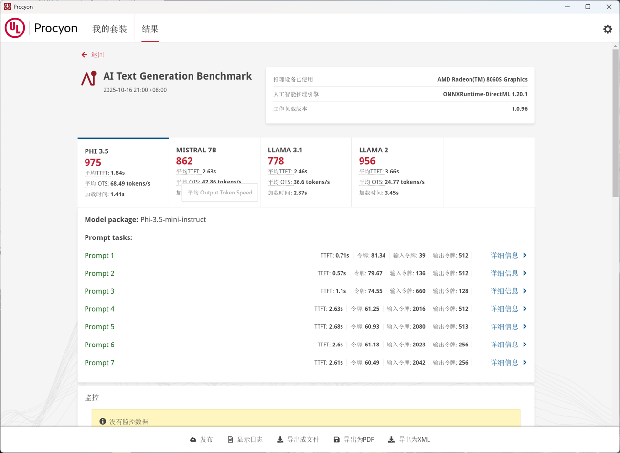 在测试多种模型能力的AI Text Generation Benchmark中,针对各类本地大模型的加载以及输出token的速度,SEAVIV AideaStation R1的表现也十分出色,Phi-3.5-mini-instruct项目获得975分,Mistral-7B项目获得862分,Llama-3.1-8B项目获得778分,Llama-2-13B项目获得956分,这些成绩证明设备在处理不同规模的AI文本生成任务时,都能保持较好的性能。