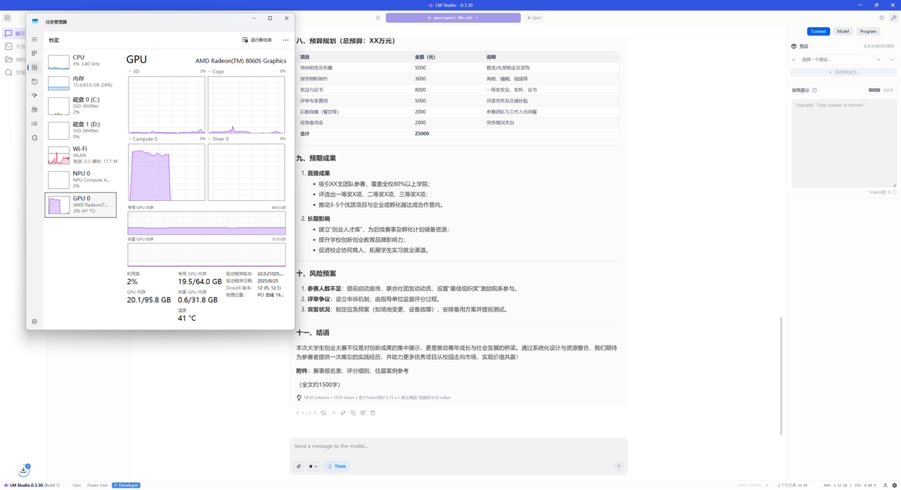第 一个测试的是参数量较小的Qwen3 30B A3B模型,其模型包体大小达到17GB,加载该模型后,让其生成一份较为详细的大学生创业大赛企划书。最终设备输出了一份内容完整、细节丰富的创业方案,涵盖项目背景、目标、实施计划、预算规划、预期成果、风险预案等多个模块,生成速度达到58.45token/s,总计输出1978个token,首个token的响应时间仅为0.15s,生成速度快,响应思考时间短,完全能满足日常AI内容生成需求。