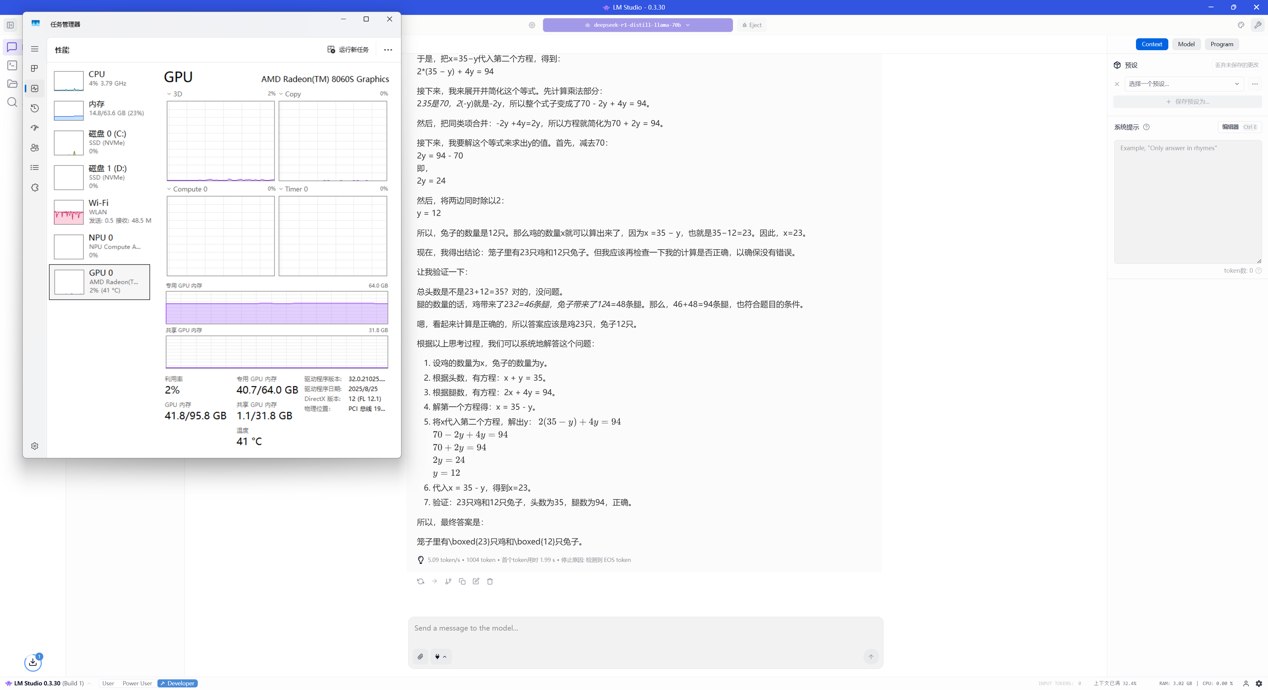 第二个测试选择了参数量更大的deepseek-r1-distill-llama-70b模型,该模型整体包体大小达到30g,测试任务为解答一道数学问题。生成结果上,DeepSeek成功算出正确答案,整个推理过程逻辑清晰,步骤完整。这次一共输出了1004tokens,速度为5.08tokens/s,首个token输出用时仅为1.99s,即使面对较大参数量的模型,设备也能保持稳定的性能和较快的响应速度,证明其在处理复杂AI任务时的可靠性。