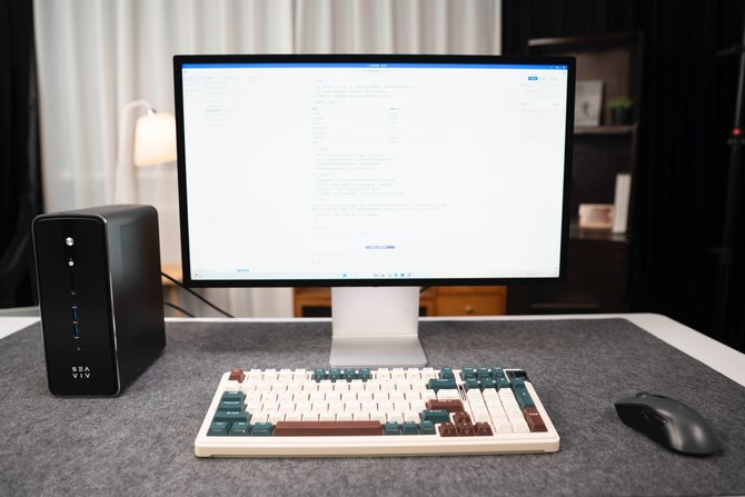 在外观设计上,SEAVIV AideaStation R1 走简约风格,整体机身采用金属材质,既保证了耐用性,也为设备散热提供了一定助力,侧板设计有散热开孔,能有效帮助机身内部热量排出。机身边缘做了圆角处理,日常搬运或摆放时不会硌手,细节处考虑得十分周到。