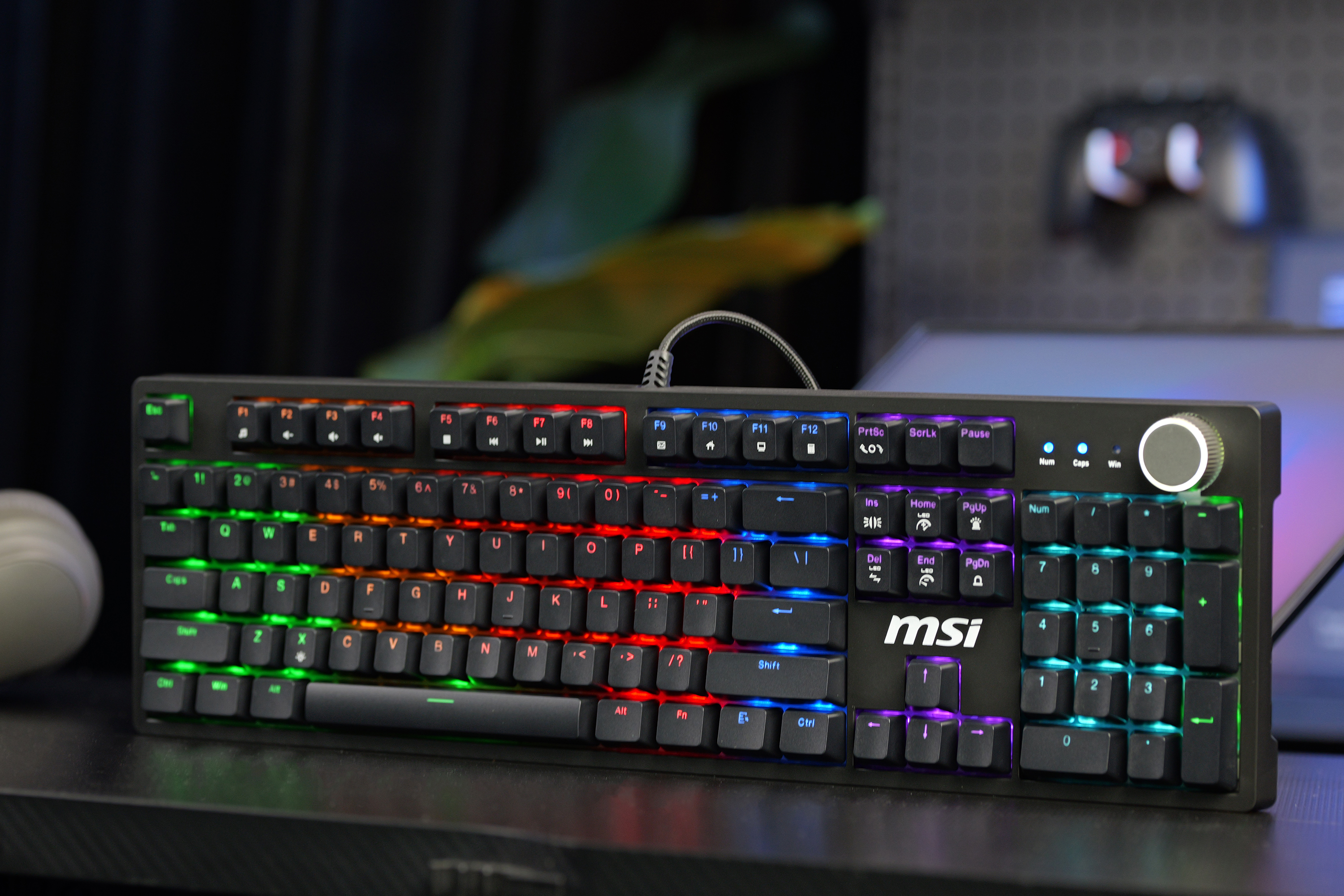 关于灯光效果上,微星GK320提供了14种灯光效果,用户可以通过“Fn+DEL”控制灯光循环,包括常亮、呼吸、单点亮、单点灭、涟漪模式、极光模式、烟花模式、雨滴模式等等,还有5组游戏灯效,并且还能通过“左边Ctrl+空格”开关灯光。