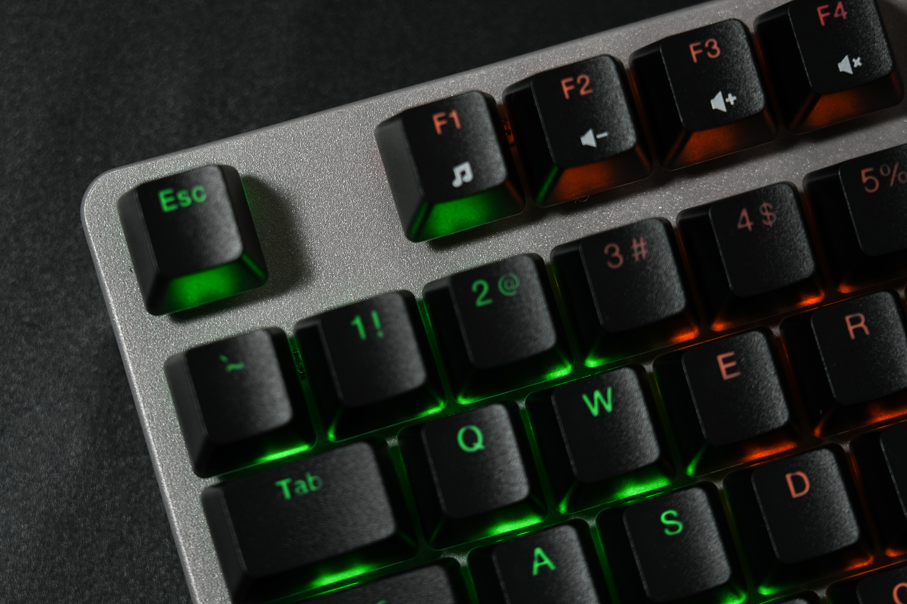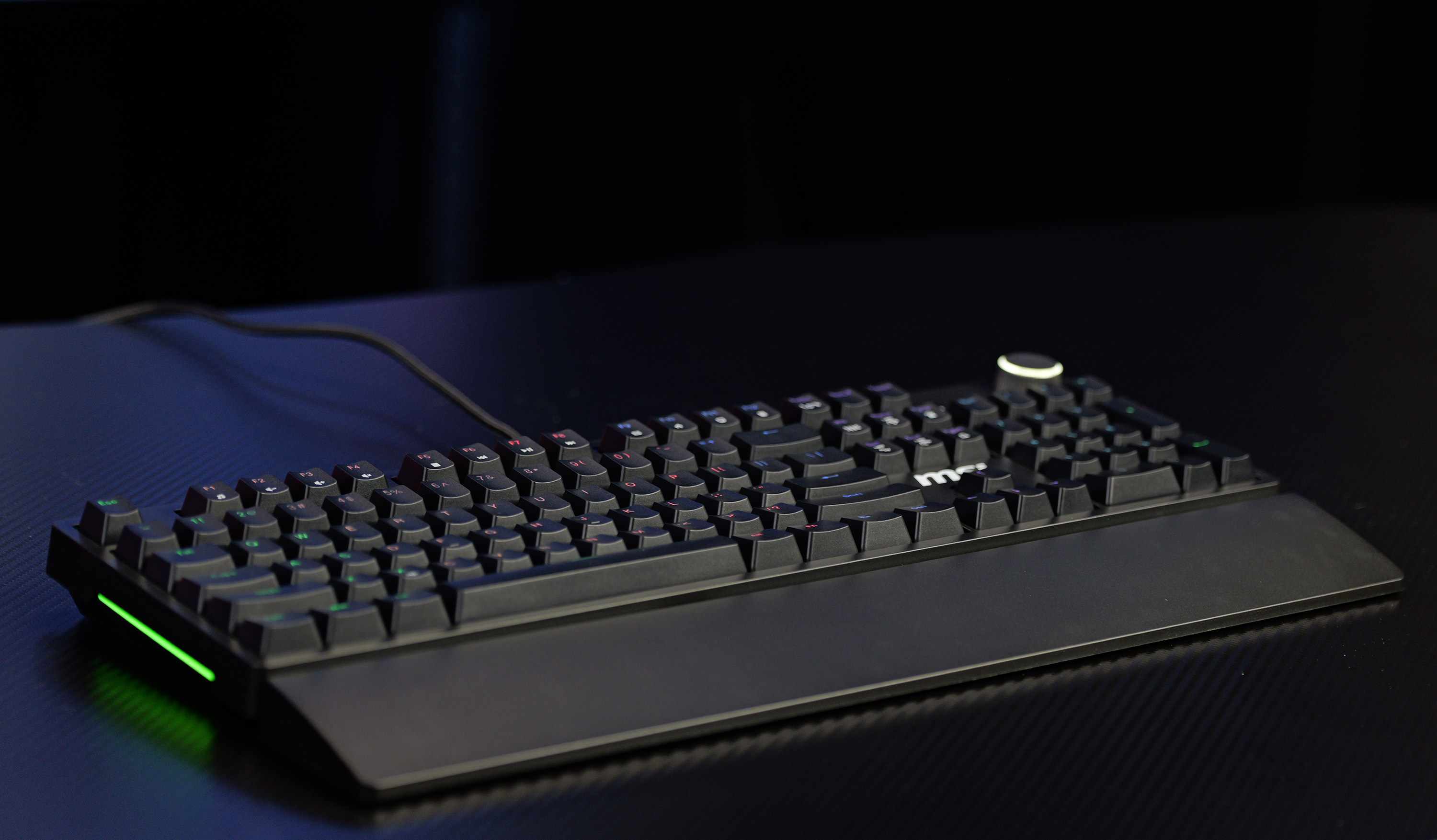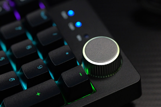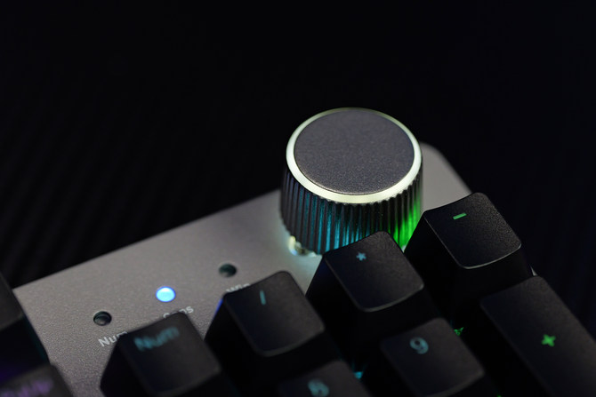 这次键盘的另外一个大的特点就是在左上角可以调整音量的旋钮,使用这个旋钮就能快速实现音量的切换,方便我们在游戏、观影的时候,一键调整音量,使用起来非常方便,并且这个旋钮的做工非常精致,同时配合上优秀的阻尼感,用起来不光顺手,还非常解压。