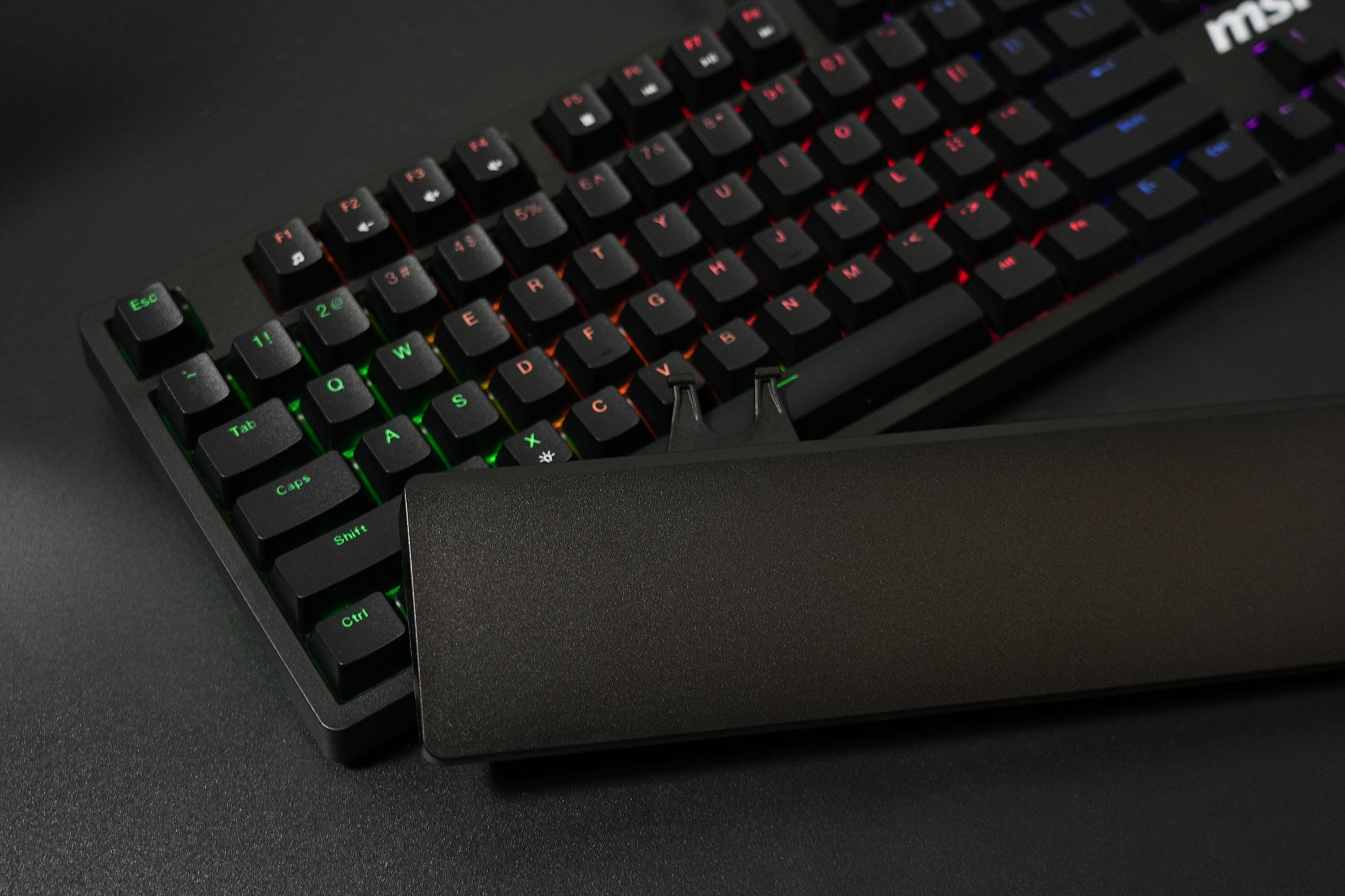 不仅如此,微星GK320游戏键盘的上盖采用了磁吸式的设计,在盖上的时候和传统的键盘外观没有太大的区别,但是拿下来之后,就能切换第二形态,秒变一把悬浮键盘。