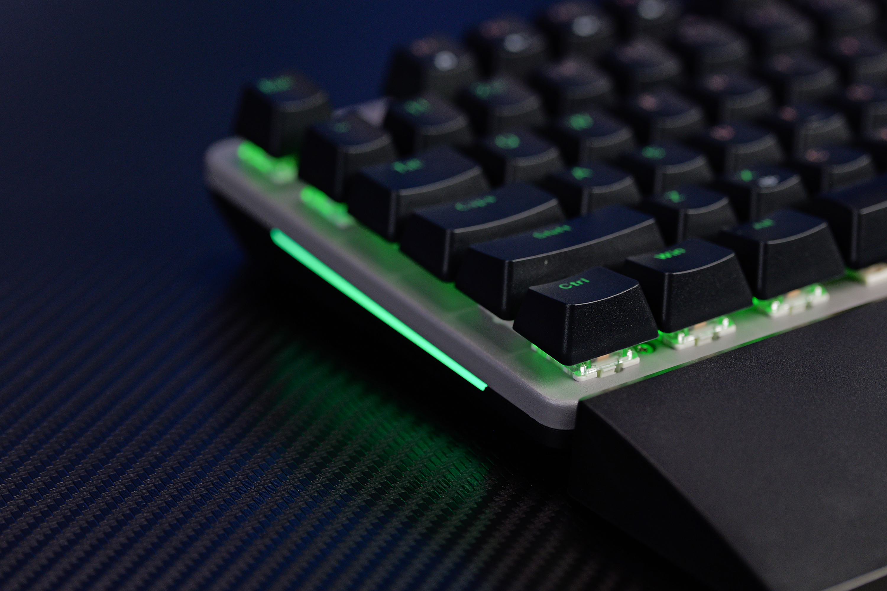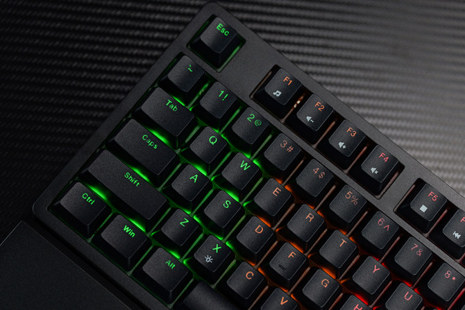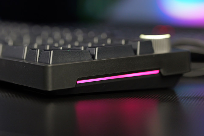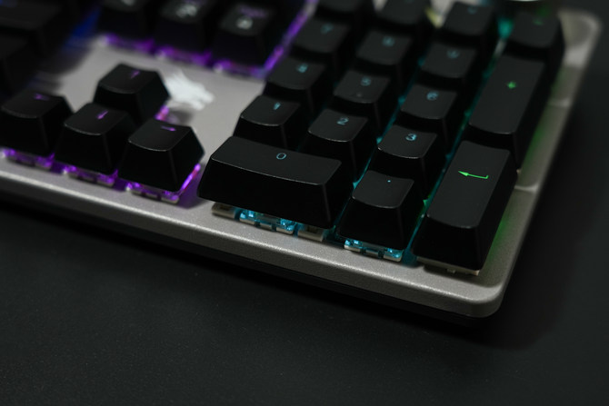并且侧边的灯条也能通过“FN+INS”进行切换,也可以单独进行关闭,对于追求灯光效果的用户而言,这款键盘的灯光效果非常漂亮,点亮之后的视觉体验非常出色。
