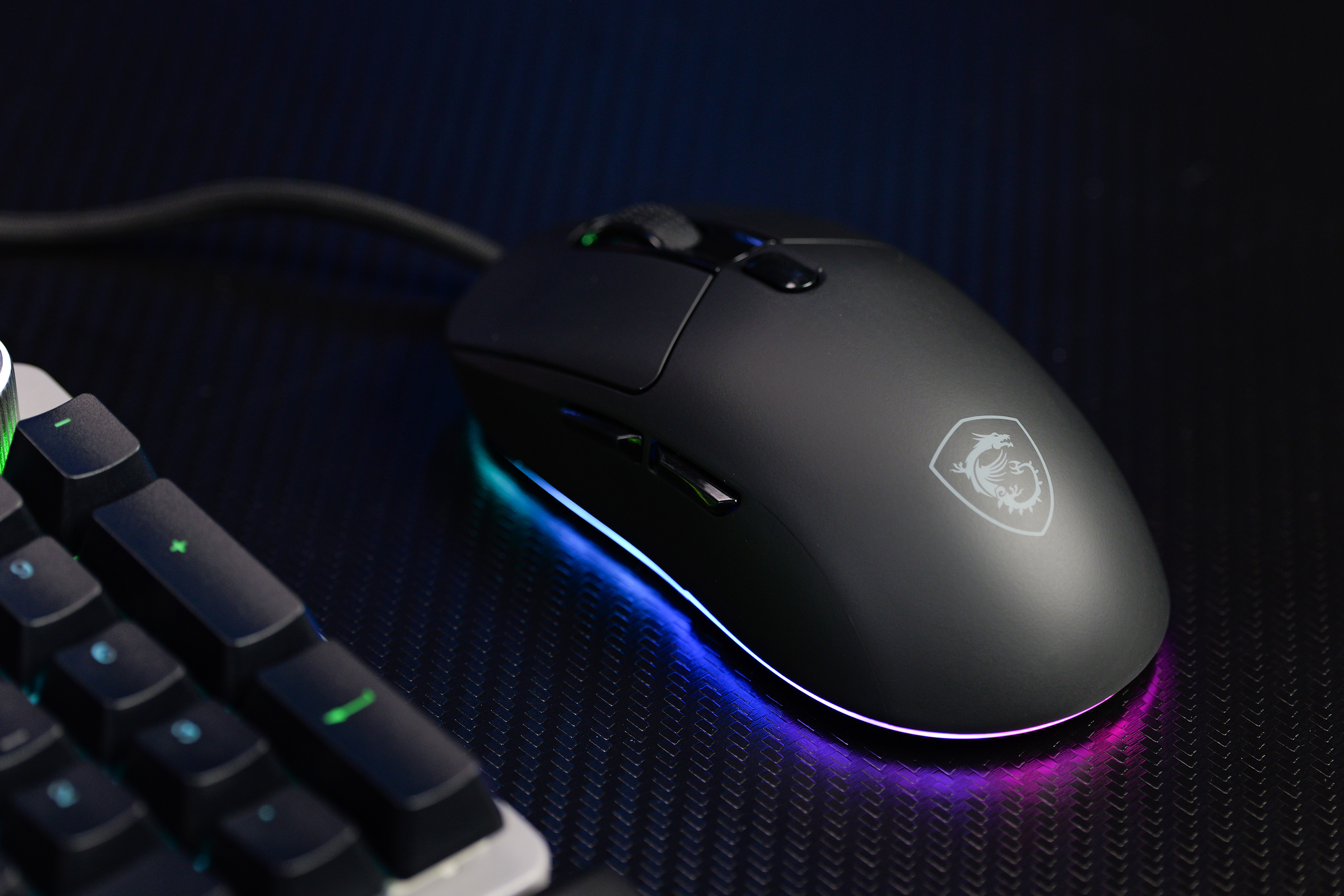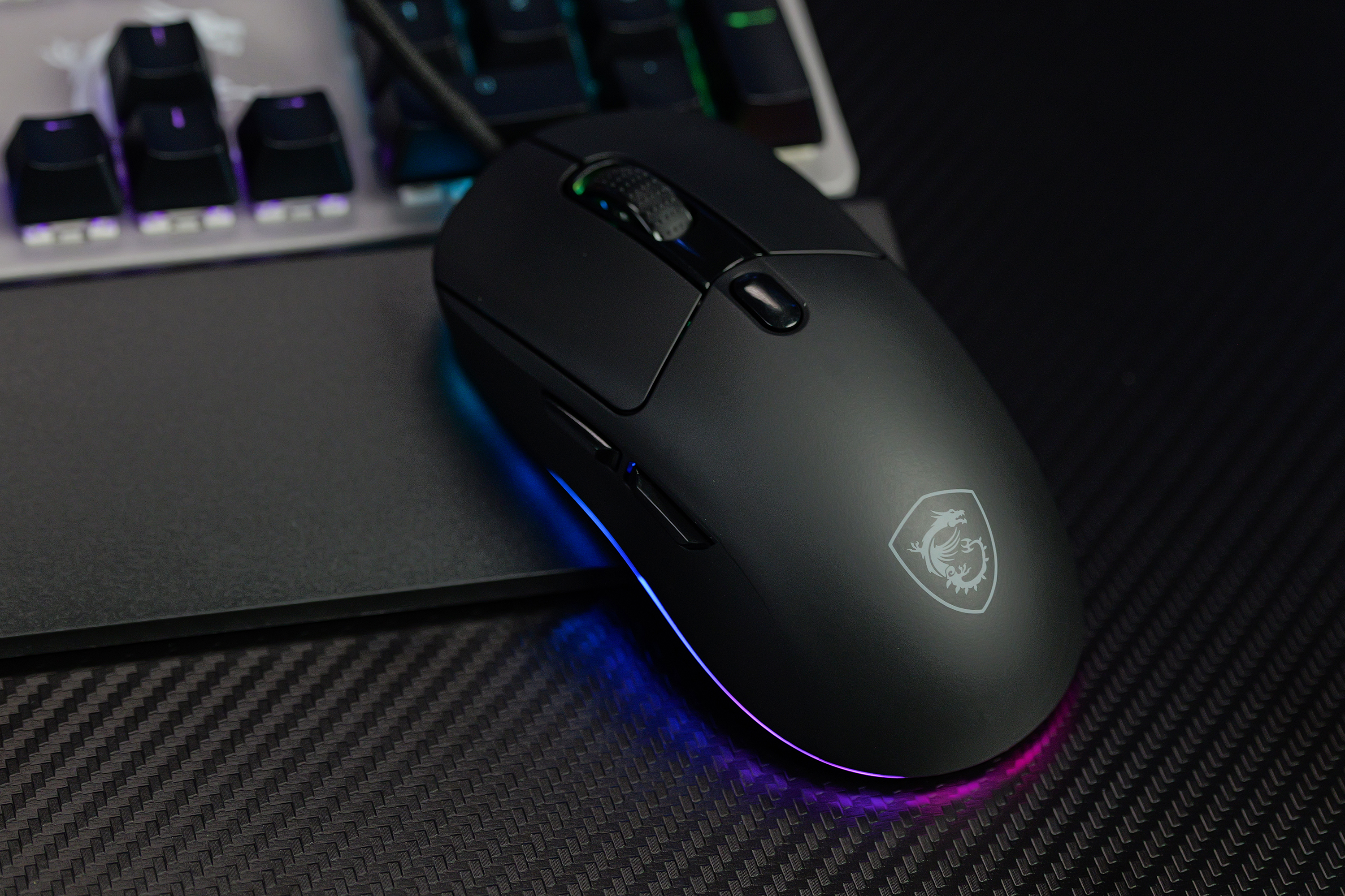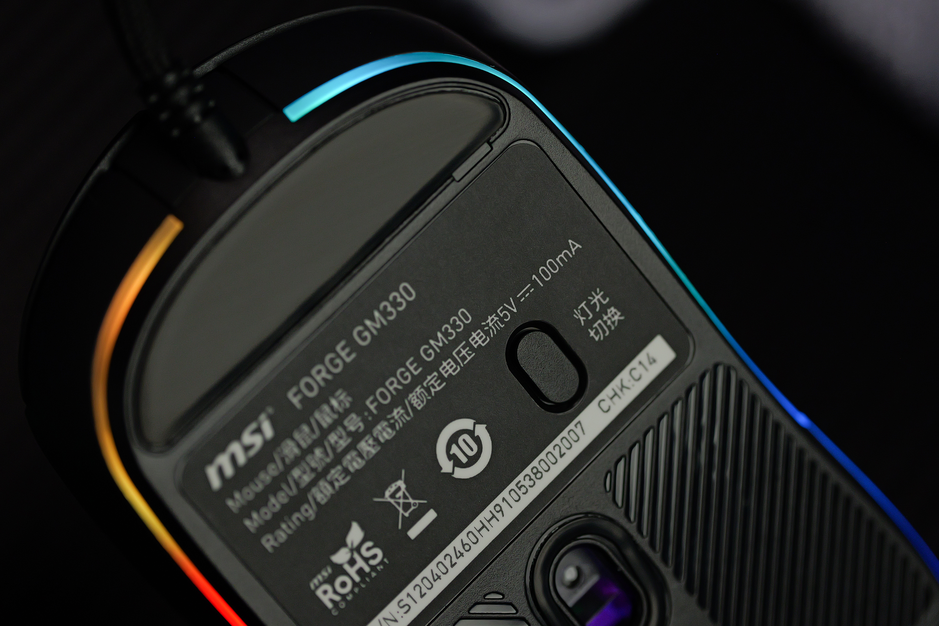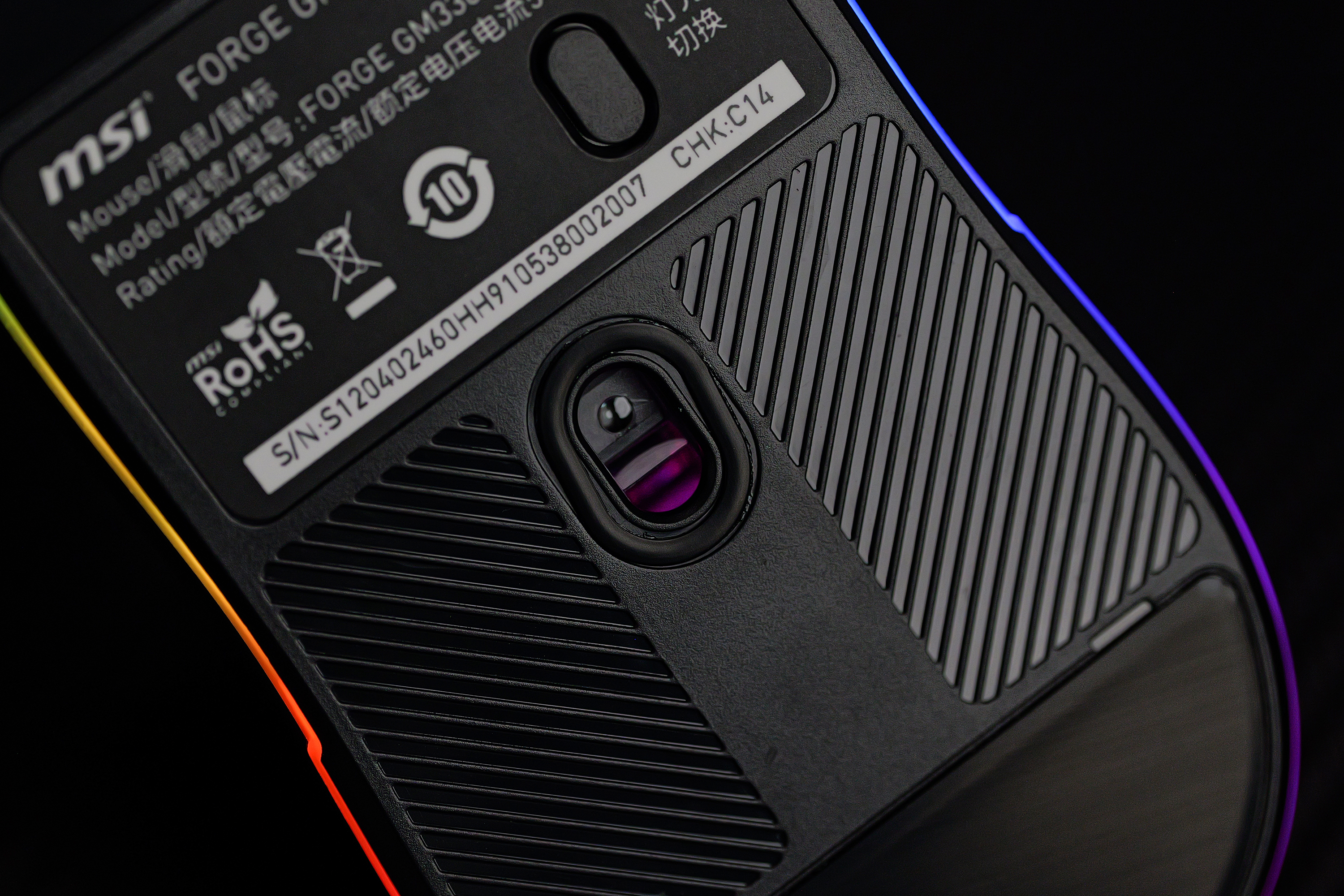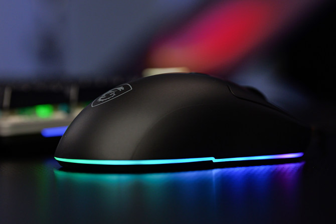 鼠标整体的质感表现不错,触感也较为细腻,鼠标的尾部还有“微星”家族的经典龙盾标识,配合上整个鼠标底部一整圈的RGB流光氛围灯,电竞感非常出色。