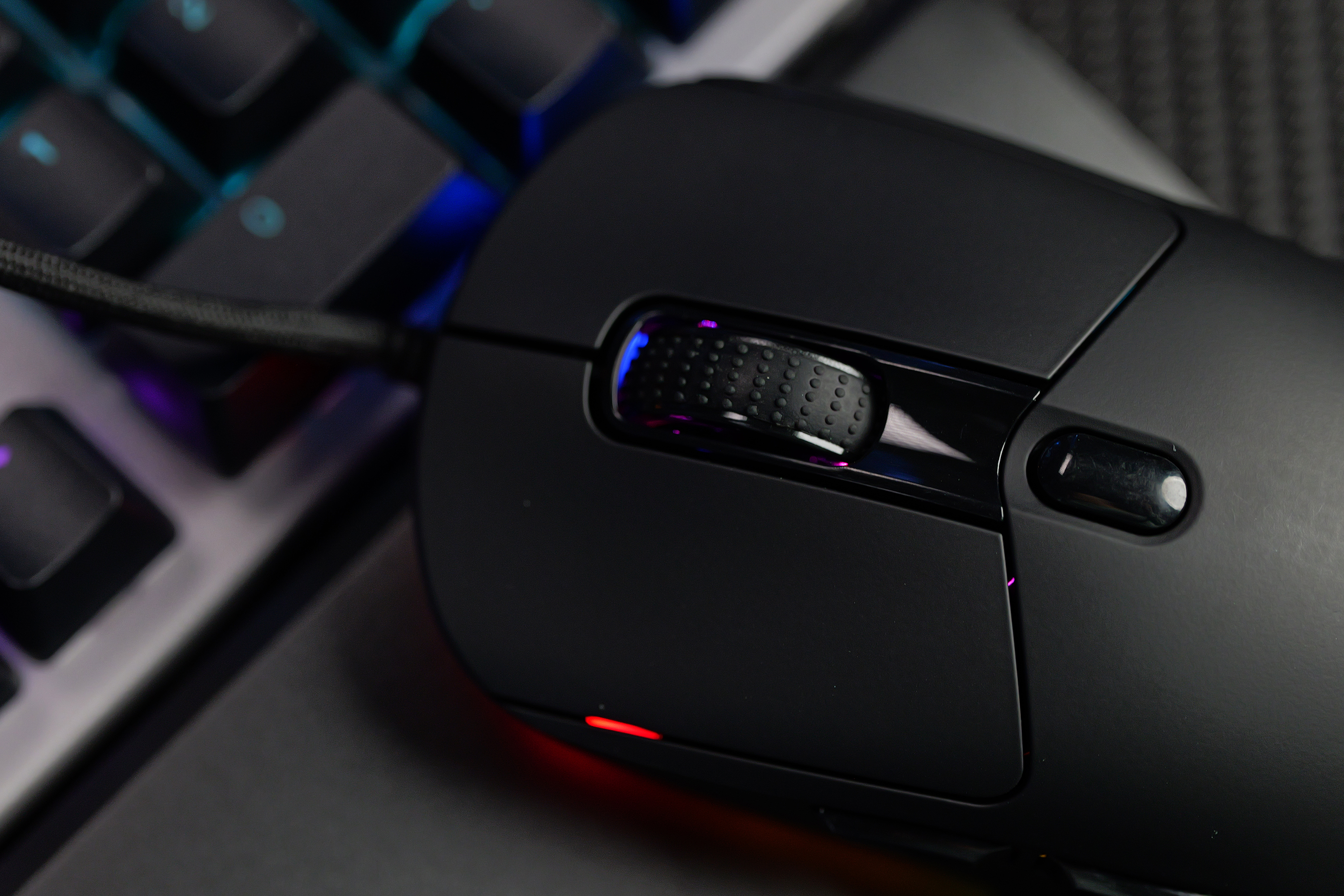 按键布局方面,除了左右按键之外,滚轮也做了防滑的处理,按键采用了环宇的微动开关,拥有5000万次的使用表现,手感清脆,回弹有力。中间是DPI调节按键,默认在800-12000之间切换,满足不同游戏类型的需求。