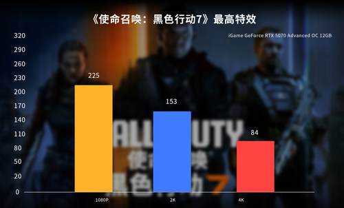 根据官方建议,《使命召唤:黑色行动7》若要在高分辨率尤其是4K画质下流畅运行游戏,推荐使用RTX 5070及以上级别的显卡。七彩虹针对不同玩家需求,对多款iGame RTX 50系列显卡进行了实测,测试设定为:极致画质、DLSS质量×4、光线追踪开启。