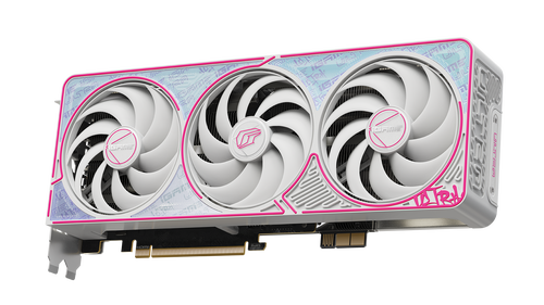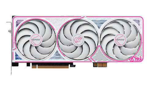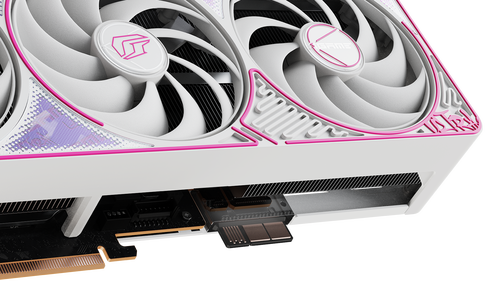 iGame RTX 50 Ultra Z 系列延续了标准版的嘻哈艺术风格,白色外甲搭配粉色描边,尽显青春活力。渐变风格也得到保留,但呈现方式由直接的“镭射”升级为柔美的“珠光”,能随光线流转呈现细腻的色彩变化。显卡外甲上分布着规律的弯曲线条,赋予整体视觉一种流动的韵律感。