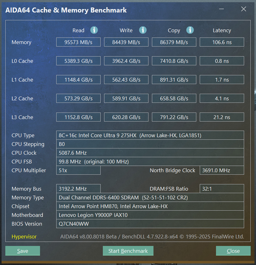 为验证英睿达DDR5 Classic CSODIMM 的实际表现,我们使用了拯救者Y9000P 2025笔记本电脑,其搭载英特尔酷睿 Ultra 9 275HX 处理器,配备RTX 5060显卡,拆机后替换原内存后进行测试。
