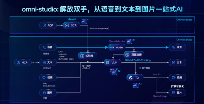 语音文本图片一站式AI处理:利用锐炫Pro B60强大的多模态处理能力,通过Omni Studio,可实现从语音到文本再到图片、视频的一站式AI工作流。在实际应用中,“小英”Agent(蒲公英精灵)可通过一台搭载双芯锐炫Pro B60的专业工作站,实现语音助手、VLM看图说话、OCR解析PDF文档内容,以及文生图、文生视频等复杂操作。