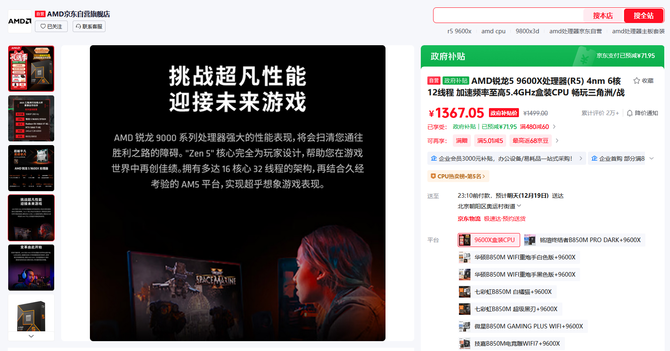 目前AMD 锐龙5 9600X处理器在在京东自营旗舰店的报价是1499元,但是目前正在享受政府补贴价,到手只要1367.05元,成为京东旗舰店会员还有0元入会抽100元E卡,首购返666京豆和晒单抽AMD羽绒马甲和定制礼盒等活动。随着售价的调整,AMD 锐龙5 9600X处理器的政府补贴价也较之前更低了一下,目前这个价位已经和之前的限时大促价差不多了,非常推荐入手。