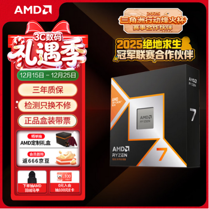 目前AMD 锐龙7 9800X3D处理器在AMD京东自营旗舰店的报价是3699元,目前享受限时政府补贴价,只要3307.96元!成为京东旗舰店会员还有0元入会抽100元E卡,首购返666京豆和晒单抽AMD羽绒马甲和定制礼盒等活动。目前AMD 锐龙7 9800X3D的政府补贴价就是近期的底价,想要把它作为圣诞礼物送出的朋友们现在购买可以节省更多预算哦!