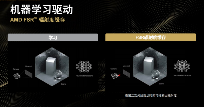 首先是FSR辐射度缓存技术,这项技术可以把“光照记忆”存在神经网络里,实时预测光线在场景中的多次反弹,相当于给路径追踪加了一张“智能缓存表”,进行网络离线训练场景光能分布规律,运行时只采样极少量射线,就能复原剩余光路,直接砍掉传统辐射度缓存60–70%的计算量。