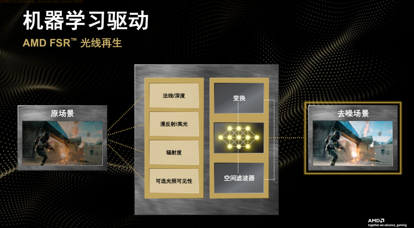 第二项技术就是FSR光线再生技术,这是通过专门的“清噪点”AI降噪器,把稀疏、带噪点的光追样本直接还原成无噪、完整细节的高保真图像。