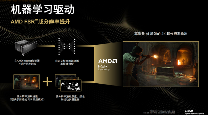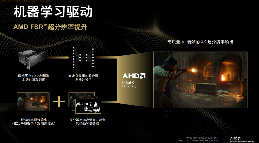 第三项技术就是FSR超分辨率技术,这次是全新的基础AMD RDNA4架构进行开发,通过高质量的AI增强技术,获取到增强的4K超分辨率输出。并且在效率和生成质量方面,相对于此前的FSR4有着更为明显的提升和更高的效率。