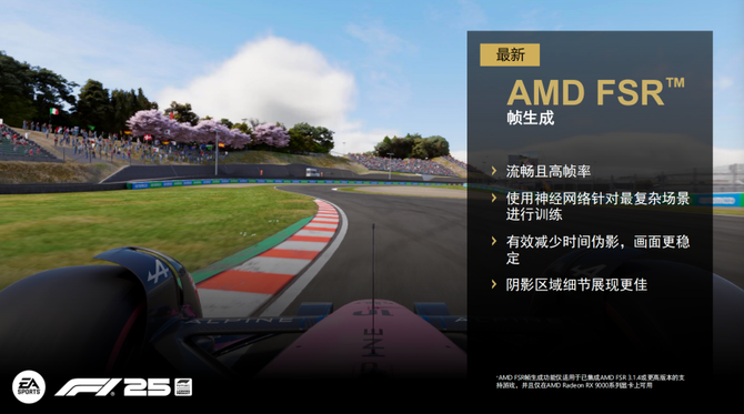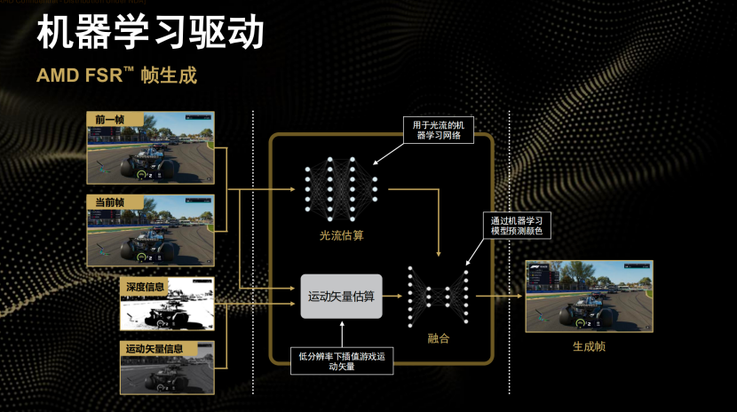 还有就是AMD的FSR帧生成技术,这次引入了强大的机器学习能力,在经过海量的数据学习、训练之后,针对更加复杂的场景优化,画面能够有效减少伪影,画面更加稳定,画面质量更好,尤其是一些高动态的游戏画面的时候,边缘和主画面不会糊掉,游戏体验更好。