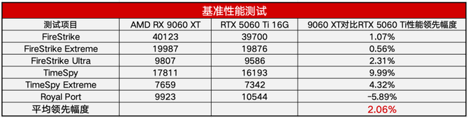 首先是基准性能测试部分,可以看到,在3DMARK的测试中,AMD RX 9060 XT的平均领先幅度来到了2.06%,其中TimeSpy的领先幅度更是接近了10%,性能有明显的领先。