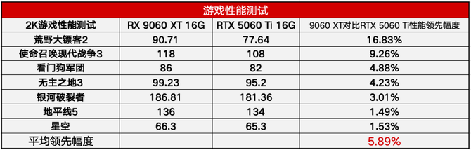 另外是游戏性能表现方面,在2K分辨率下,7款主流的游戏大作中,AMD RX 9060 XT的平均帧数领先5.89%,其中荒野大镖客2的领先幅度更是高达16.83%。
