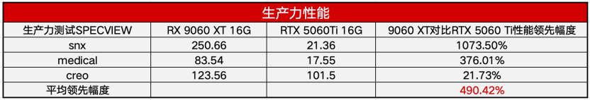 生产力表现方面,我们选择了SPECVIEW进行测试,这个测试中,三项测试的平均领先幅度来到了490%,其中snx的测试项目中,更是来到了1073%,RX 9060 XT的性能领先幅度非常明显。