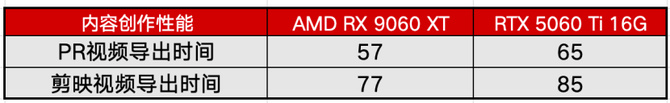 内容创作性能表现方面,我们选择了PR和剪映进行测试,测试所用的素材为索尼A7R5拍摄的4:2:2 4K素材,可以看到在后期编辑之后导出同样规格的视频,AMD RX 9060 XT的性能也有明显的优势。