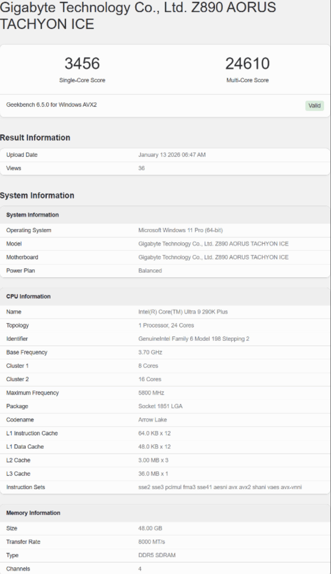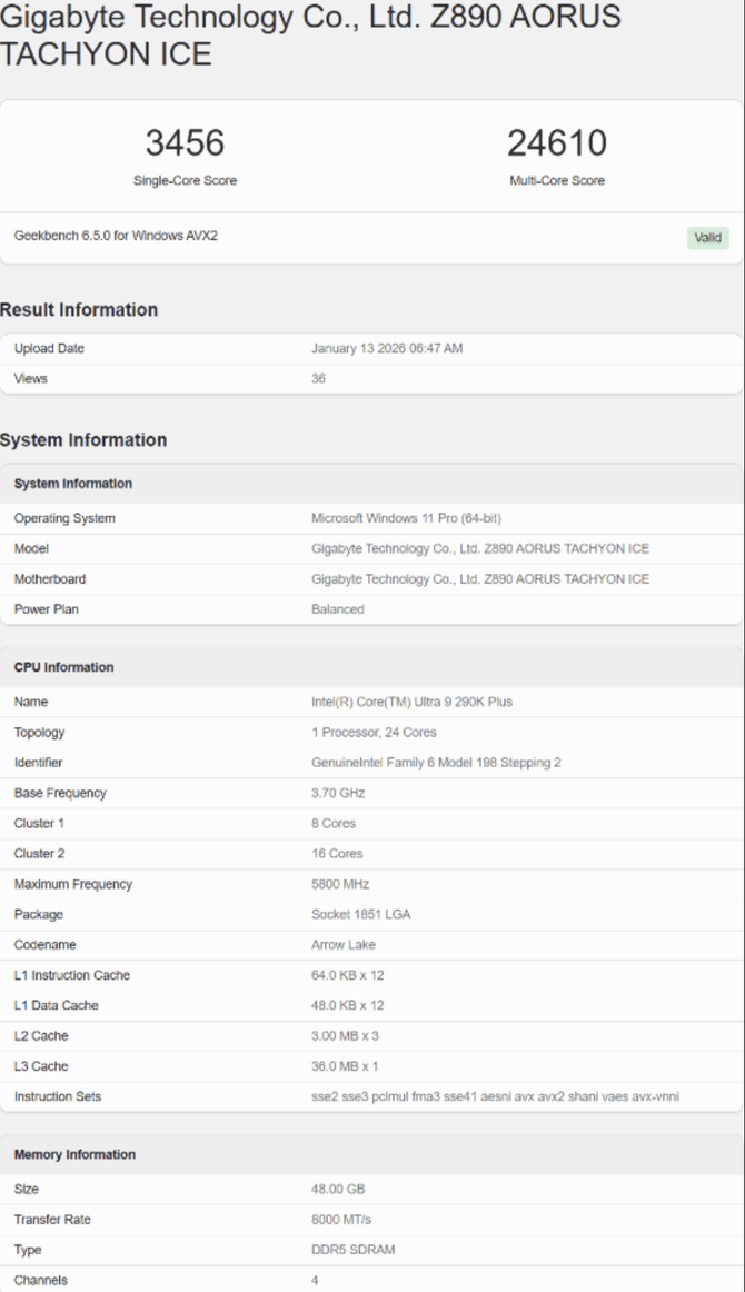 英特尔酷睿Ultra 9 290K Plus的测试成绩最近在网上曝光了测试成绩,在GeekBench 6.5的测试中,单核心的分数为3456,多核心的分数为24610,相比上代Ultra 9 285K,单核性能提升约7%,多核性能提升达9%,即便对比AMD锐龙9 9950X3D,Ultra 9 290K Plus在单核表现上领先2%,多核性能优势则扩大至11%。