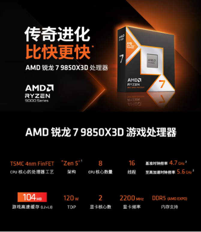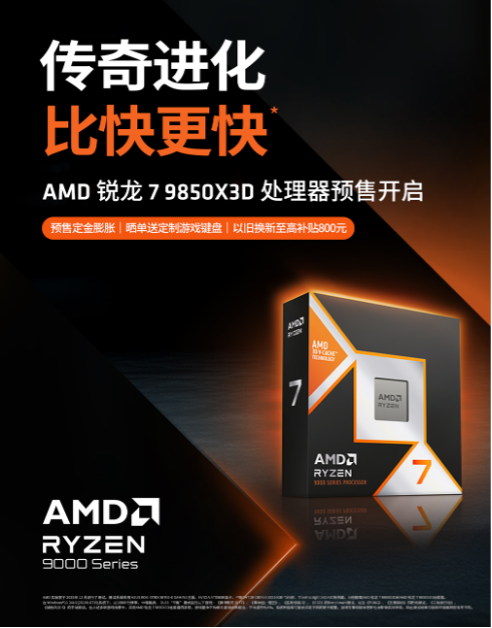 AMD(超威)锐龙9000X3D系列处理器已经成为了当下竞技玩家的最优选择,而在今年的CES国际消费电子展上,AMD再下一城,正式推出了全新的锐龙7 9850X3D处理器,将这一系列推向了新的高度。在广大DIY玩家的热烈期盼下,这款“传奇进化 比快更快”的锐龙7 9850X3D处理器及组装机产品已经在AMD京东自营旗舰店正式开启预售,下面我们就来详细了解一下。