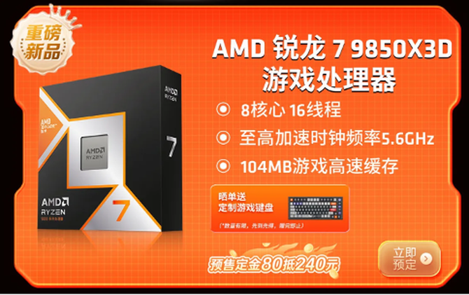 准备购买AMD 锐龙7 9850X3D处理器单品的朋友可以直接前往上方链接参与预售活动,目前只要支付80元定金,即可享受支付尾款的时候膨胀至240元的限时福利;而且购买锐龙7 9850X3D处理器之后进行晒单,就送定制款游戏键盘,不过数量有限,先到先得。当然还能参与上面提到的AMD店铺活动。