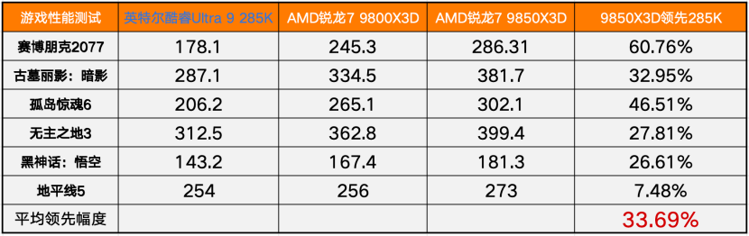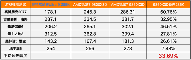 作为衡量游戏卡顿的1% Low帧,AMD锐龙7 9850X3D的1% Low帧的相对于上代9800X3D领先超过10%,对于英特尔Ultra 9 285K的话,则是领先超过35.76%,带来更为丝滑流畅的游戏体验。
