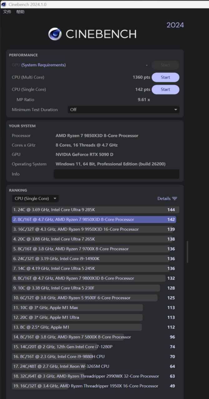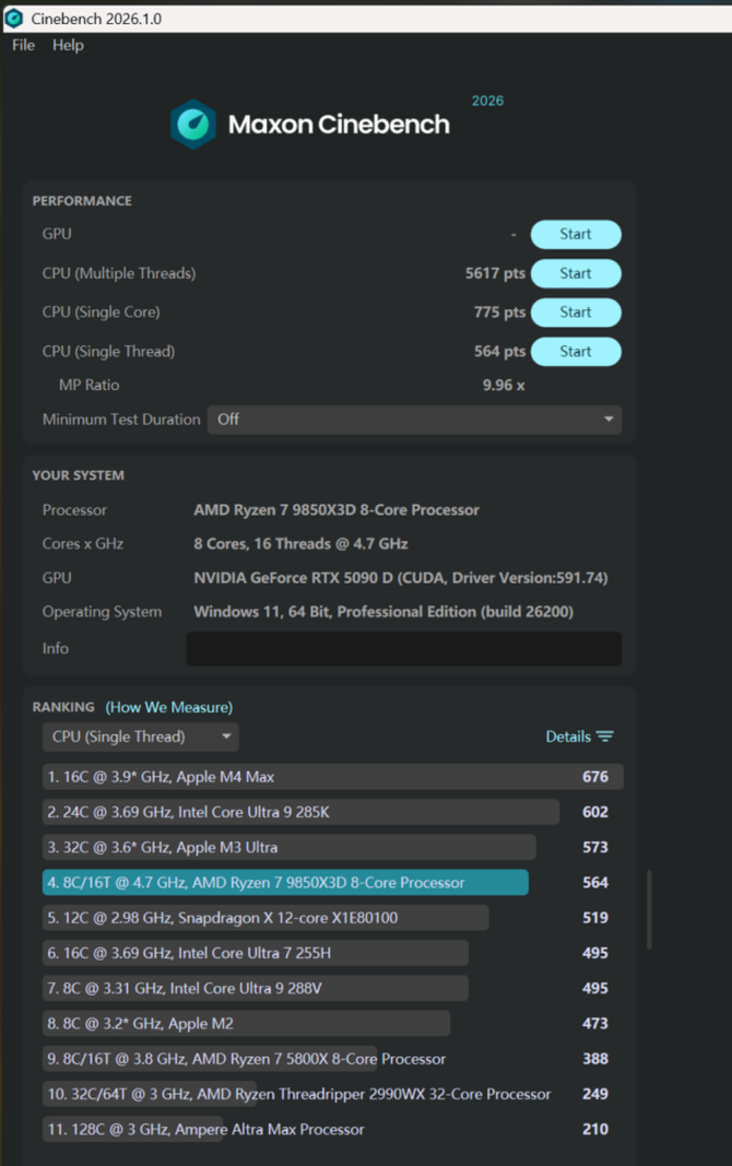 CINEBENCH 2026测试中,AMD锐龙7 9850X3D的单线程成绩为564,单核心性能为775,多核心性能为5617,综合性能表现优秀。